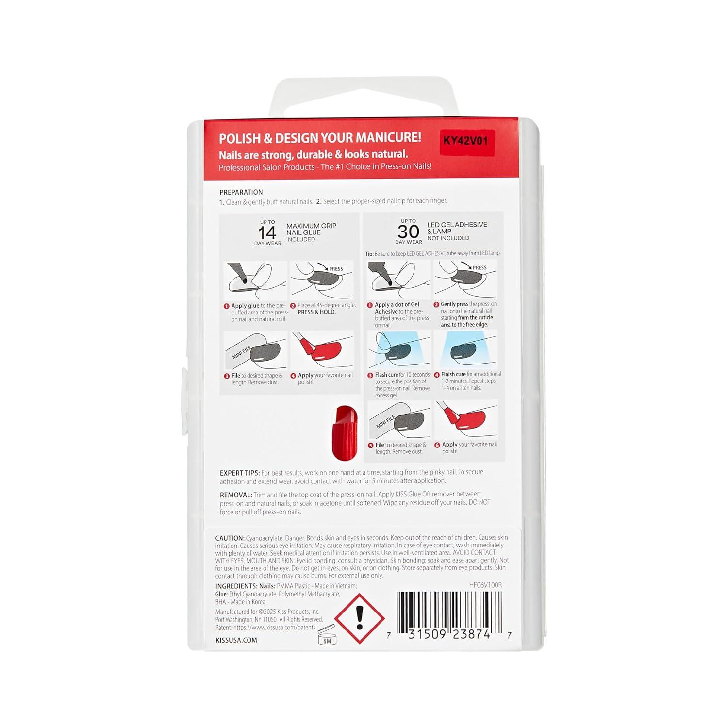 Your nails, your way. KISS Professional Full Cover Nail Kits are fully customizable—file, shape, and design them to your style. Choose your wear time: 14-day hold with the included glue, or 30-day gel extension wear using our Gel Adhesive and LED Lamp (sold separately). KISS Professional Full Cover Nails are natural-looking, strong, and easy to remove—made with the same high-quality material used by salon pros.