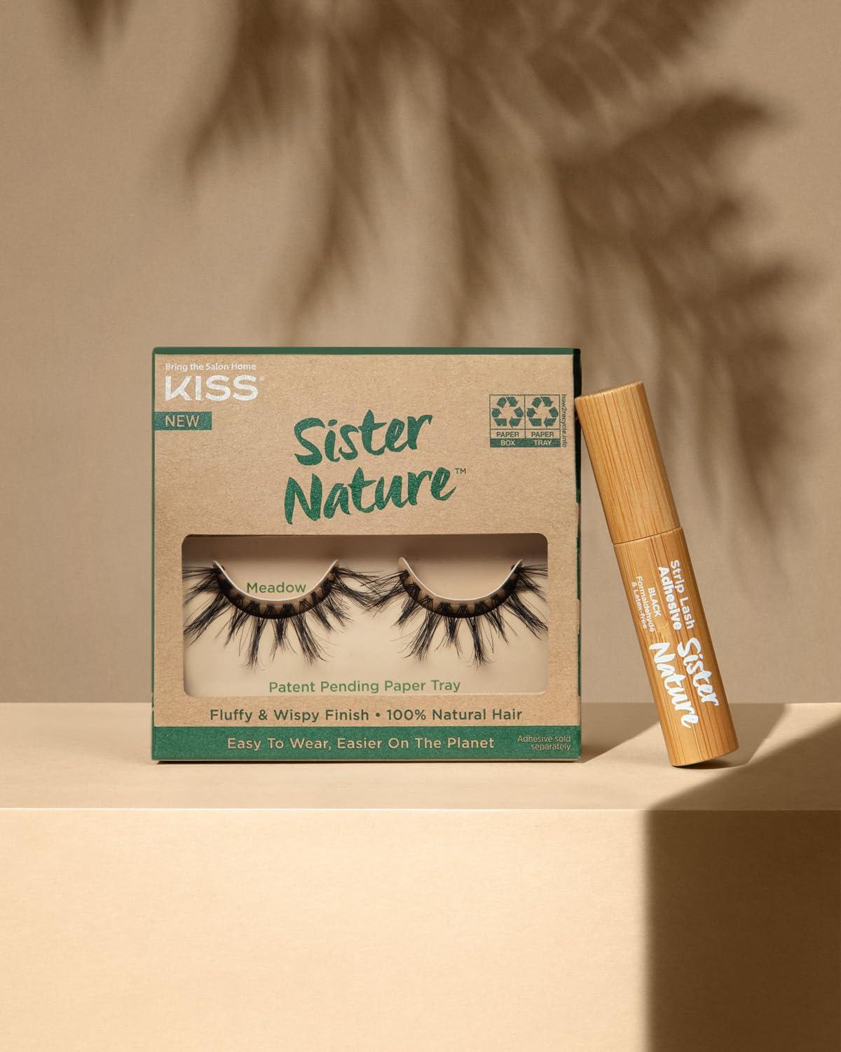 KISS Sister Nature Lashes are Easy To Wear & Easier On The Planet. These false eyelashes that are handmade with a 100% natural hair that has a fluffy & wispy finish! Not only are these fake lashes reusable, contact lens friendly, vegan, & cruelty free, the recyclable paper box is printed with soy ink and has a reduced PET plastic inner tray & cover. Use with Sister Nature Strip Lash Adhesive which is sold separately in black or clear.