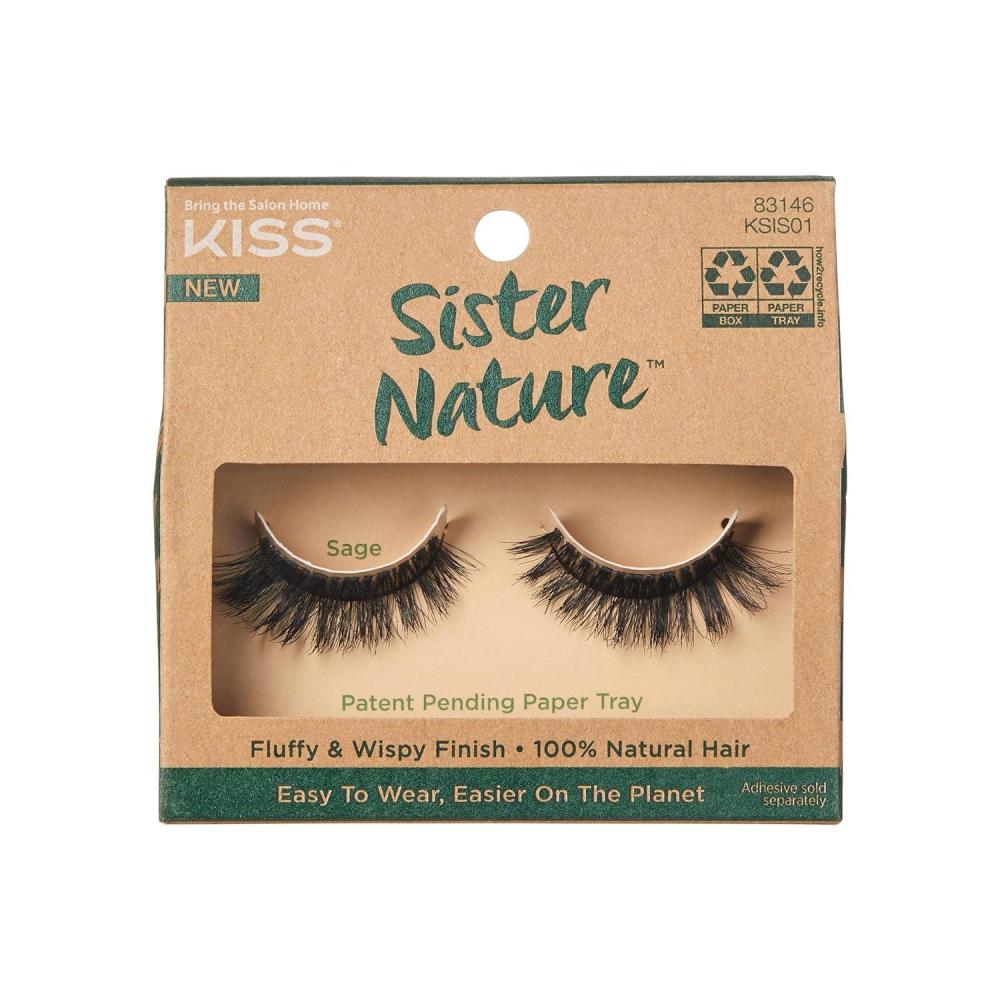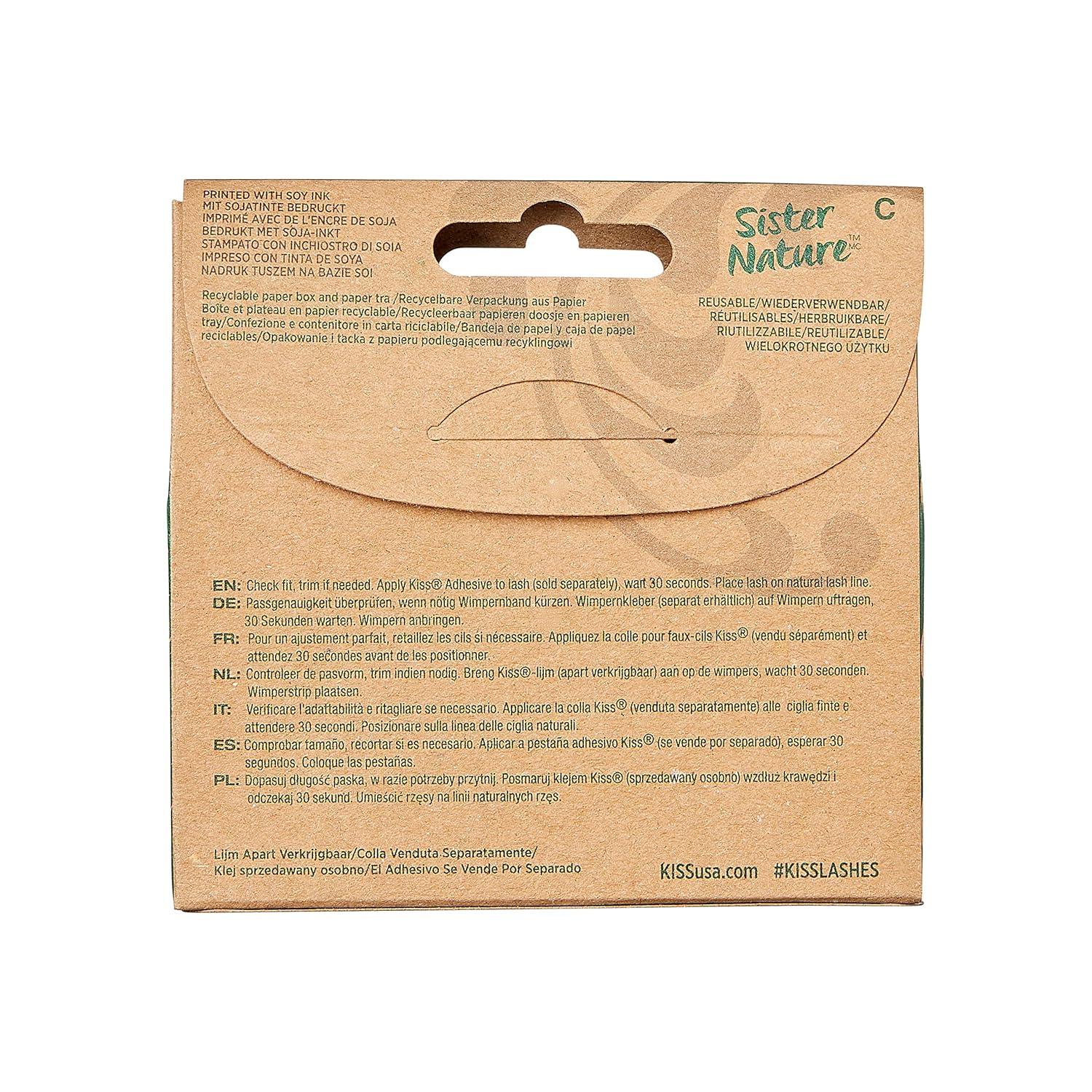 KISS Sister Nature Lashes are Easy To Wear & Easier On The Planet. These false eyelashes that are handmade with a 100% natural hair that has a fluffy & wispy finish! Not only are these fake lashes reusable, contact lens friendly, vegan, & cruelty free, the recyclable paper box is printed with soy ink and has a reduced PET plastic inner tray & cover. Use with Sister Nature Strip Lash Adhesive which is sold separately in black or clear.